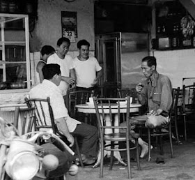 Directly, opposite the old police station was a short row of wooden shops and one of the shops we used to frequent was Ah Seng's bicycle repair shop. Ah Seng was the village bicycle repairman cum barber. He could often be seen fixing a flat tyre, replacing broken chains or spokes and doing other repair work. When a customer walked into the shop for a hair-cut, he would pause from his work, wipe and wash his greasy hands and then attend to his customer.